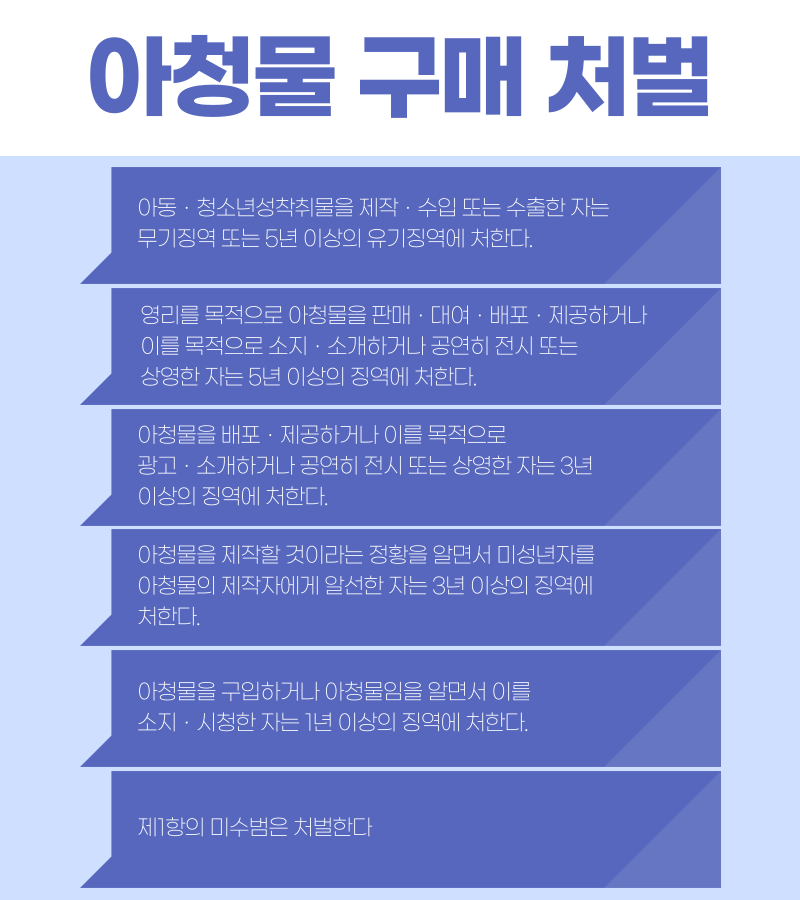아청물 구매를 했다면 아동ㆍ청소년의 성보호에 관한 법률 제11조에 의해 1년 이상의 징역에 처하게 되는데요. 만일 본인이 직접 영상을 유포했다면 3년 이상의 징역형을 선고받게 됩니다.
