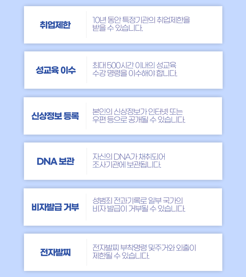 많이들 알고 계시는 전자발찌 착용도 있고, 성범죄자 알림e와 같은 공간에 본인의 신상정보가 등록되는 처분, 취업제한, 성교육 프로그램 이수와 같은 처분을 받게 될 수도 있습니다.