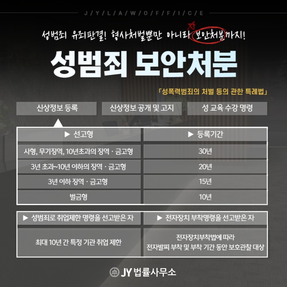이뿐만 아니라 형이 종료된 후에도 신상 정보가 등록 및 공개되며 전자발찌 착용해야 하며 취업 제한 등 사회생활이 사실상 어려워지는 보안 처분이 추가로 부과됩니다.